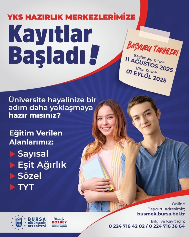 Sosyal Hizmetler Dairesi Başkanlığı Hayat Boyu Öğrenme Şube Müdürlüğü’ne bağlı Hürriyet, Gemlik, Heykel, Naim Süleymanoğlu, Orhangazi, Kestel, Vakıf Bera, Mustafakemalpaşa ve Karacabey YKS Hazırlık Merkezlerinde uzman rehber öğretmenler eşliğinde yıl boyunca sayısal, eşit ağırlık, sözel ve TYT kursları düzenlenecek. 1 Eylül Pazartesi gününe kadar devam edecek olan kayıtlar, busmek.bursa.bel.tr adresinden online olarak yapılacak. Detaylı bilgi için 0224 716 42 02 veya 0224 716 36 64 numaraları aranabilir veya sosyal medya hesaplarından iletişime geçilebilir.